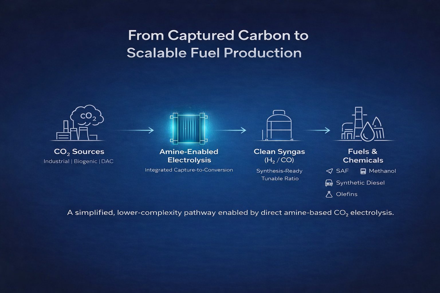 The integrated electrochemical platform converts captured CO₂ into synthesis-ready syngas (H₂/CO). The tunable ratio enables compatibility with established downstream fuel and chemical processes.